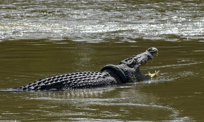 Hiện chưa rõ lý do chiếc lốp xe máy mắc kẹt ở cổ con cá sấu. Hình ảnh mới nhất về con vật cho thấy nó có dấu hiệu bị khó thở, khiến nhiều người lo ngại rằng chiếc lốp xe đang dần giết chết con cá sấu.