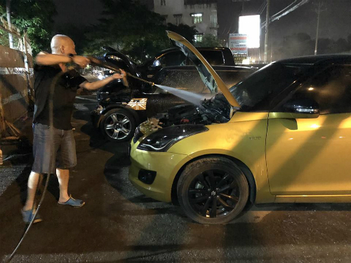 Anh Duy Đức tự làm sạch khoang động cơ chiếc Suzuki Swift.